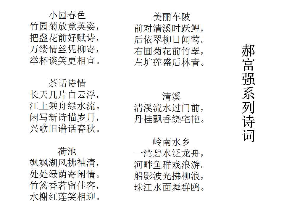 此次读书会,还特别推出了郝富强系列诗词《美丽车陂》《小园春色》《茶话诗情》《荷池》《清溪》《岭南水乡》,从各个不同角度歌颂风景秀美的车陂,展现车陂的美丽风貌。他还现场作诗,盛赞“书香车陂”:“诗书满座风云气,良友一堂富贵春”。