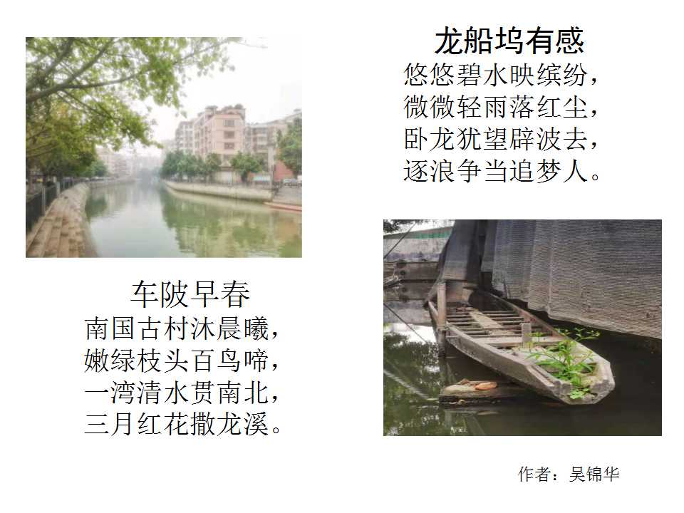 吴锦华创作的两首诗歌,皆以车陂涌景有关。一首是歌颂《车陂早春》,“嫩绿枝头百鸟啼”,“三月红花撒龙溪”。另一首是《龙船坞有感》:“悠悠碧水映缤纷,微微轻雨落红尘,卧龙犹望辟波去,逐浪争当追梦人。”