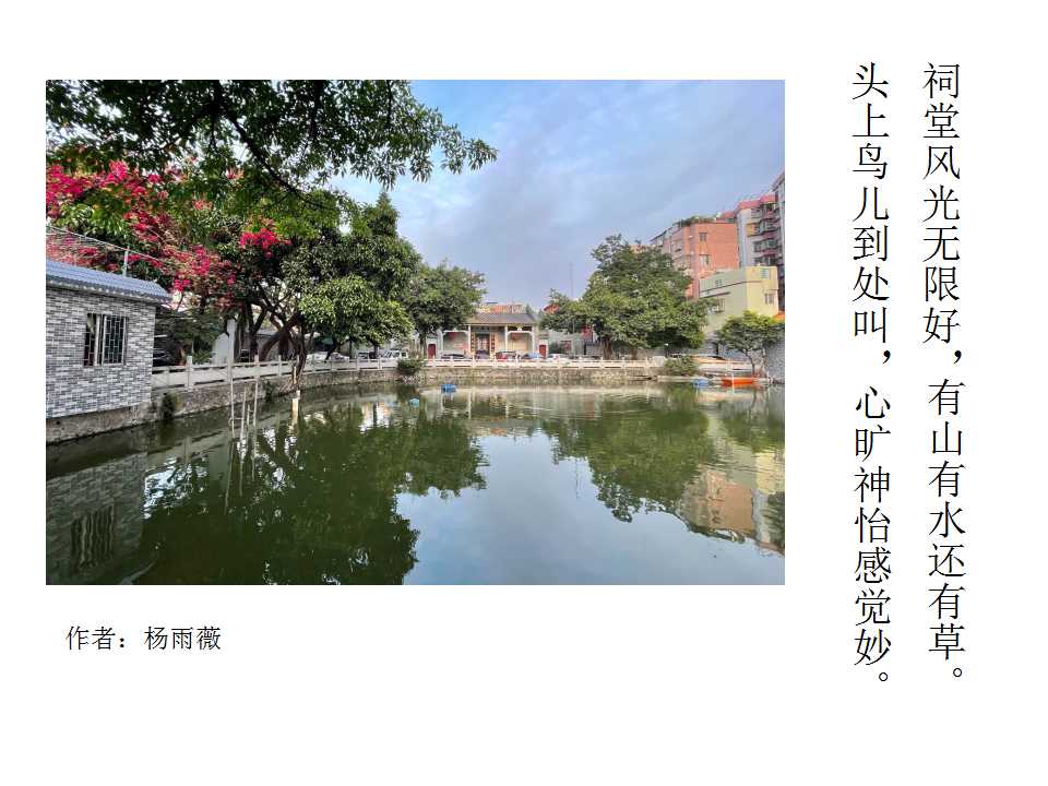 杨雨薇拍摄了同章简公祠前的风光,蓝天、碧水、花红,并赋诗一首:“祠堂风光无限好,有山有水还有草。头上鸟儿到处叫,心旷神怡感觉妙。”
