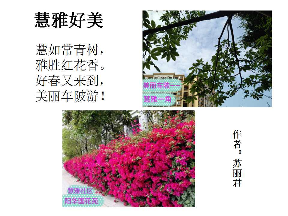 苏丽君在车陂慧雅社区工作,社区三角梅红红火火,她拍下红艳花色,写了这首《慧雅好美》:“慧如常青树,雅胜红花香。好春又来到,美丽车陂游!”慧雅好美,满屏春色哟。