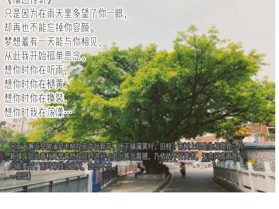 邹蓝对涌边的那棵大榕树,有着无尽的喜欢。她说,因雨天邂逅车陂涌旁老树在雨中吐新芽、地上铺满黄叶,而树上却是生机勃勃一片新绿,如此春秋更替竟然同时进行,内心甚为震撼。