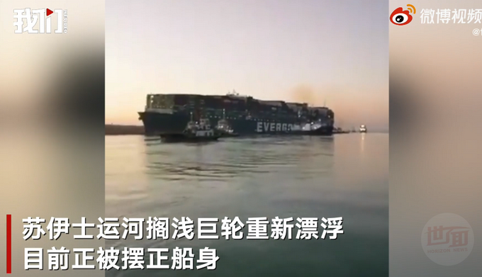 3月29日,苏伊士运河搁浅巨轮重新漂浮,目前正被摆正船身。画面显示,“长赐号”船尾大幅“摆动”,释放被堵住的航道。