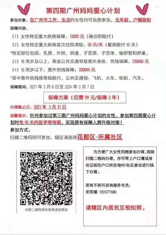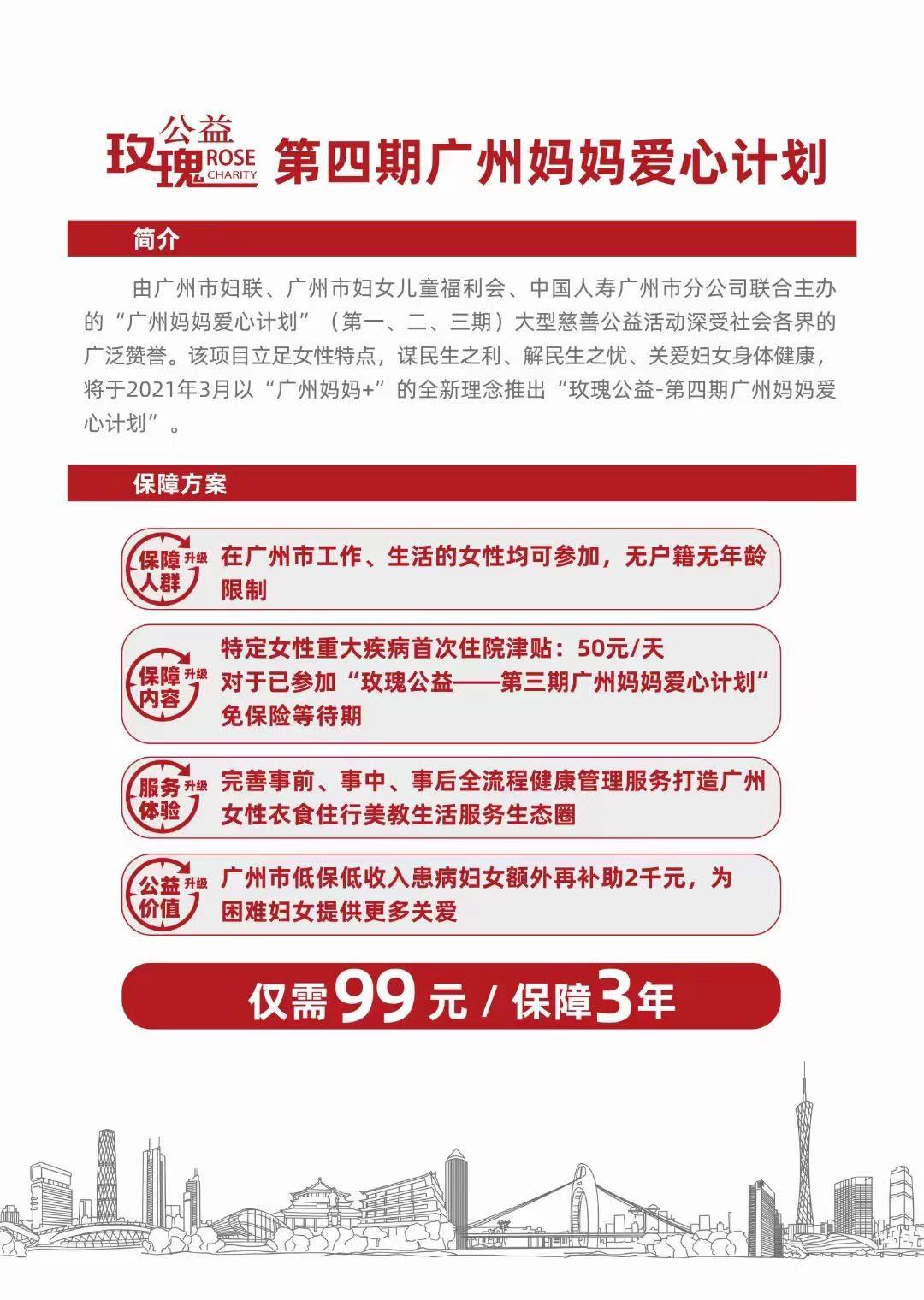99元保三年,不限户籍、年龄,在广州市工作、生活的女性,均可参加第四期广州妈妈爱心计划。