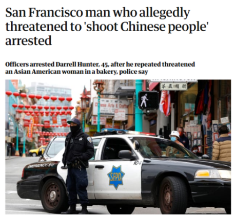 据英国《卫报》报道,3月31日,美国旧金山警方逮捕了一名有反亚裔仇恨暴力倾向的男子。该男子屡次进入一家面包店,高喊“向中国人开枪”,威胁店内一名亚裔女子,并做出开枪手势,模拟射击。