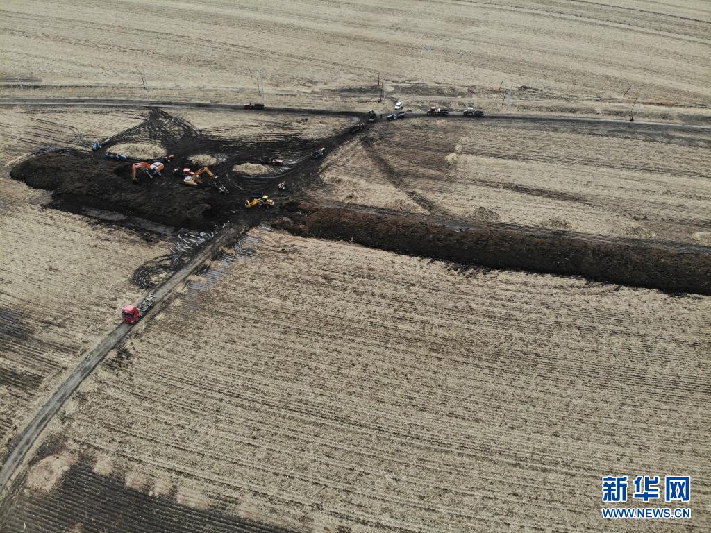 3月29日,在黑龙江省五常市沙河子镇福太村,工作人员在回填被盗挖的黑土(无人机照片)。新华社记者 马知遥 摄