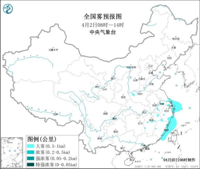 预计,4月2日上午,浙江沿岸海域、福建沿岸海域、长江口、舟山群岛附近海域、东海西北部部分海域将有能见度不足1公里的大雾。中央气象台4月2日6时继续发布大雾黄色预警。