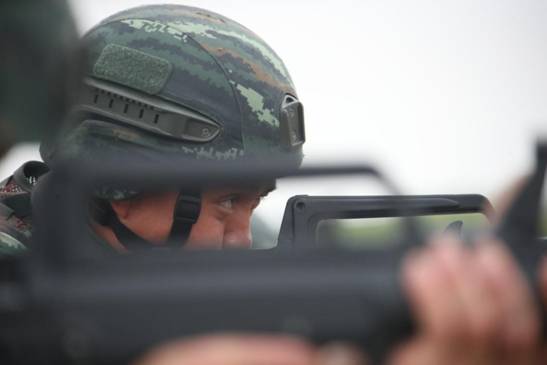 手持突击步枪的彭星正在心无旁骛地瞄准目标(潘桂添 摄)