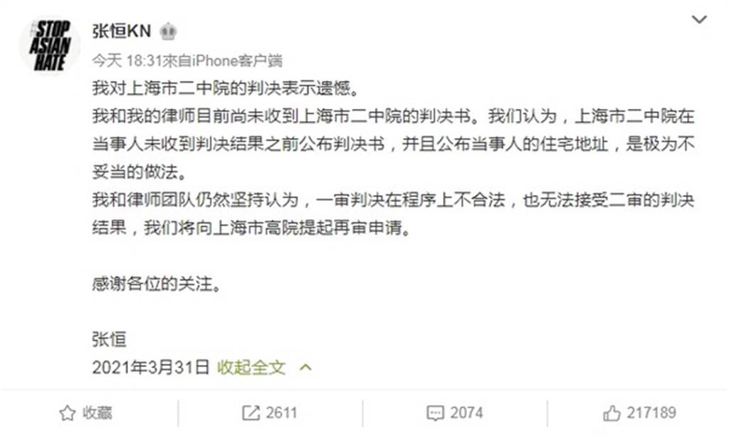 张恒随后也发文坦言,「我对上海市二中院的判决表示遗憾」,目前他和律师都没有收到判决书,「我和律师团队仍然坚持认为,一审判决在程序上不合法,也无法接受二审的判决,结果,我们将向上海市高院提起再审申请。」言下之意还没有打算放弃。
