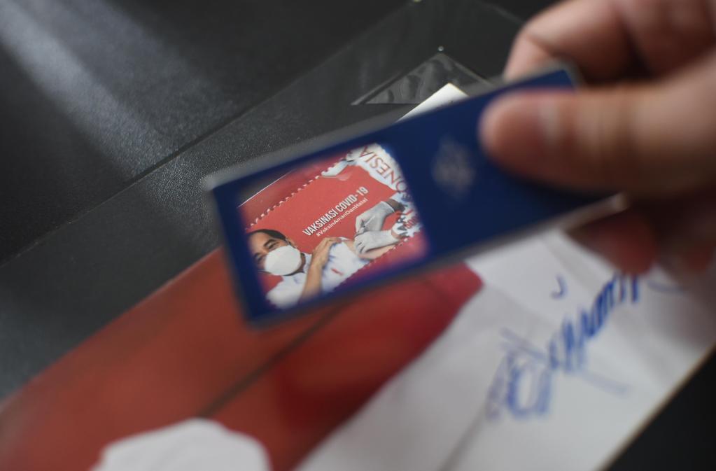2月26日,工作人员在印度尼西亚雅加达展示新冠疫苗主题的邮票。邮票的画面内容是佐科接种中国科兴公司的克尔来福新冠疫苗。新华社发(祖卡南摄)