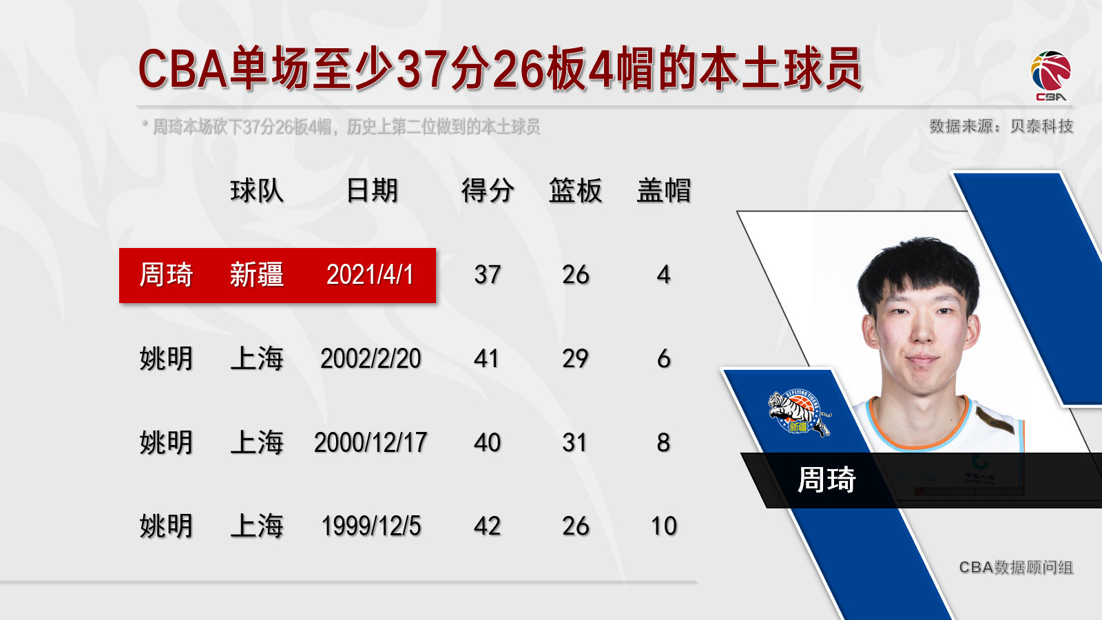 周琦个人总篮板数超越姚明,升至CBA第42位。而达成单场37+26+4,让周琦成为历史上第二位做到的本土球员。