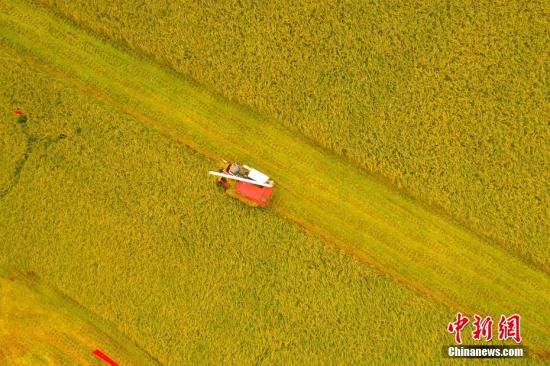 资料图:收割机驰骋在田间收割作业(图文无关)。周星亮 摄