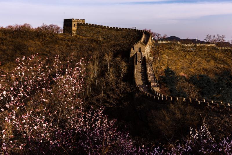 融融春日,怀柔慕田峪长城春花盛绽,山桃、杏花、梨花簇拥围绕,形成一片望之不尽的粉白花海,在苍劲古老的长城的映衬下更显蓬勃绚烂。