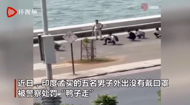 近日,印度孟买的五名男子外出没有戴口罩,被警察处罚“鸭子走”。视频中,五人蹲在地上学鸭子走路,旁边站了一名警察看着他们。在不远处的树荫下,还有几名警察和群众盯着他们看。视频在社交媒体上引发热议,有人认为警察的惩罚是幽默的,但也有人认为这是在进行阶级歧视。印度受疫情影响,在某些地区实行宵禁,并对未戴口罩的人罚款。当地媒体报道,有人称这五名男子是主动要求用鸭子走代替罚款。