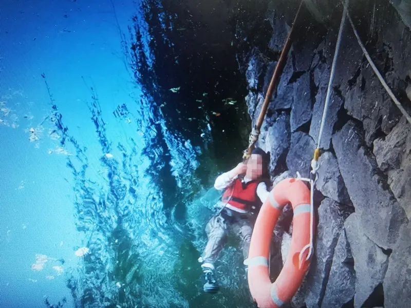 往下看,一名小女孩大半个身子泡在水塘里,脸色苍白,全身发抖,死死抱着手中的救生杆……