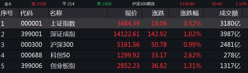 截至收盘,沪指报3484.39点,涨幅0.52%,成交额3179.53亿元;深成指报14122.61点,涨幅1.02%,成交额3987.48亿元;创业板指报2852.23点,涨幅1.31%;上证50指数报3616.76点,涨幅0.95%。