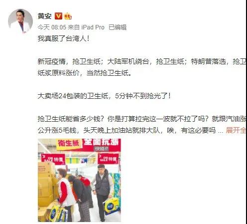 台湾艺人黄安今日(2日)在社交媒体惊呼,台湾再次出现了抢购卫生纸的风潮,“大卖场24包装的卫生纸,5分钟不到抢光了!”