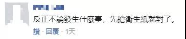 有台湾网友表示,出现任何风吹草动,都会让台湾人去抢购卫生纸。“反正不论发生什么事,先抢卫生纸就对了。”
