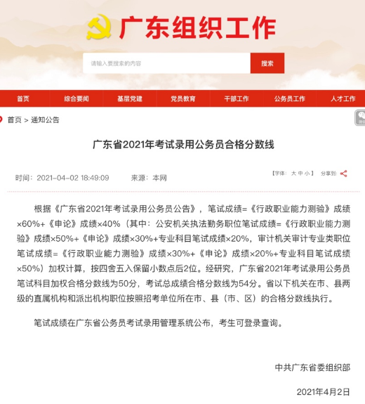 中共广东省委组织部在官网发布公告称,经研究,广东省2021年考试录用公务员笔试科目加权合格分数线为50分,考试总成绩合格分数线为54分。省以下机关在市、县两级的直属机构和派出机构职位按照招考单位所在市、县(市、区)的合格分数线执行。