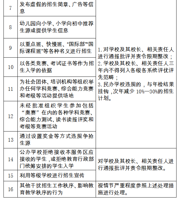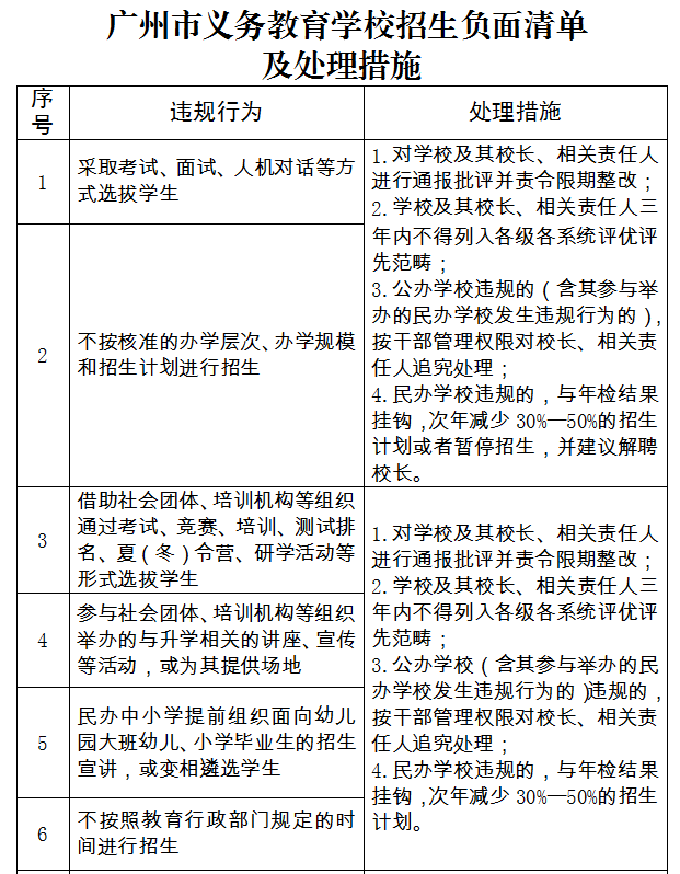 答:我市一贯强调严厉打击违规招生行为,明确要求各区教育行政部门要完善违纪举报和申诉受理机制,加强监督检查,及时处理群众信访或舆情线索,严肃查处各类招生违规行为。对出现广州市义务教育学校招生负面清单中违规招生行为的单位和个人,教育部门均按规定严肃处理。如果家长发现校外培训机构或学校涉嫌违规招生,可致电政府热线“12345”反映,或向市、区教育部门反映。