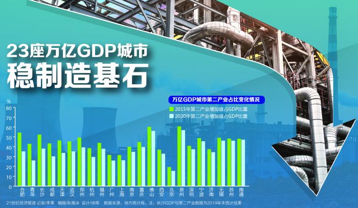 但2020年末,23座城市第二产业增加值的平均占比下降到37.31%。占GDP比重超40%的城市减少到7座,仅泉州和佛山的制造业依然占据“半壁江山”。