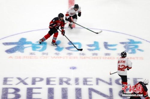4月2日,运动员在冰球项目测试活动中。当日,“相约北京”冰上项目测试活动冰球比赛在北京的国家体育馆拉开帷幕。 中新社记者 韩海丹 摄