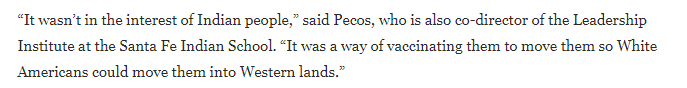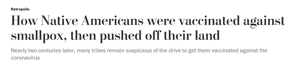 △《华盛顿邮报》的报道援引圣塔菲印第安学校领导力计划主任佩科思的话说,接种天花疫苗不是为了印第安人的利益,而是为了侵占他们的土地。