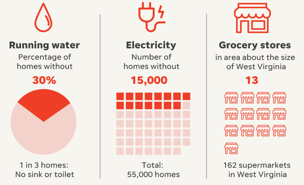 △数据显示,约三分之一的纳瓦霍家庭没有水槽或马桶,约四分之一的纳瓦霍家庭没有电,在相当于西弗吉尼亚州面积大小的区域内只有13家商店,而西弗吉尼亚州则有162家。(图片来源:《今日美国报》)
