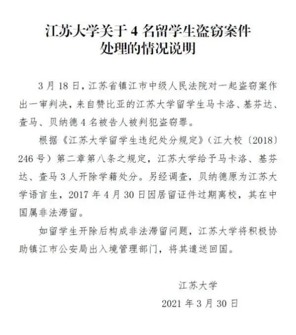 与此同时,江苏大学也做出回应:对三名被告人已经予以开除学籍处份,另一名被告人早在2017年的时候,就已经因为居留证件过期离校,其在中国属于非法居留。