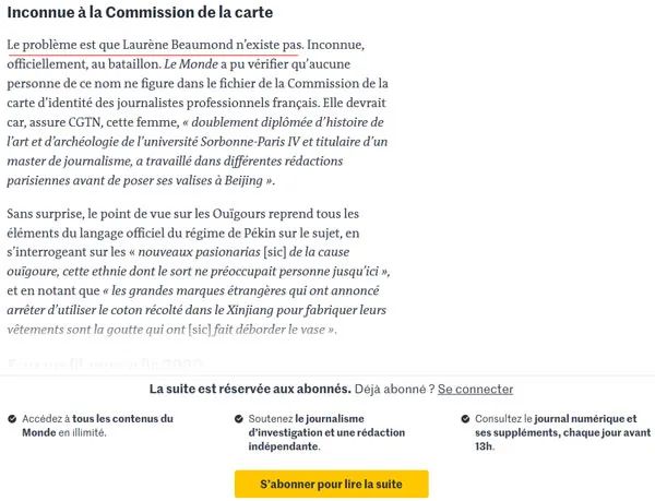 法国著名媒体《世界报》几天前刊文,指责中国中央电视台CGTN法语频道“制造”了一个法国记者,来“维护中国的新疆政策”。这篇大作的题目非常耸人听闻:“当中国CGTN电视台凭空制造出一位法国记者的时候……”,副标题是:“某个名叫罗汉娜·博蒙(Laurène Beaumond)的人在中国官方媒体阐述北京有关维吾尔族人和台湾的话题”。