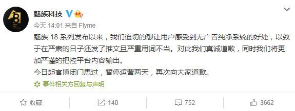 @红星新闻4月4日消息,4月4日是清明节,今日早间,魅族科技发了一条微博文案,称“魅族18系列5G安全纯净旗舰,祭奠被干掉的广告”。对此,网友们纷纷表示不适。目前这条微博已被删除。午后,魅族科技道歉称,魅族18系列发布以来,迫切的想让用户感受到无广告纯净系统的好处,以致于在严肃的日子还发了推文且严重用词不当。对此我们真诚道歉。今日起官博闭门思过,暂停运营两天。