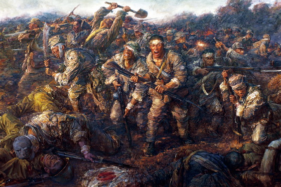 无论时代如何发展,我们都要锻造舍生忘死、向死而生的民族血性。在朝鲜战场上,志愿军将士面对强大而凶狠的作战对手,身处恶劣而残酷的战场环境,抛头颅、洒热血,以“钢少气多”力克“钢多气少”,谱写了惊天地、泣鬼神的雄壮史诗。志愿军将士冒着枪林弹雨勇敢冲锋,顶着狂轰滥炸坚守阵地,用胸膛堵枪眼,以身躯作人梯,抱起炸药包、手握爆破筒冲入敌群,忍饥受冻绝不退缩,烈火烧身岿然不动,敢于“空中拼刺刀”。在他们中涌现出杨根思、黄继光、邱少云等30多万名英雄功臣和近6000个功臣集体。英雄们说:我们的身后就是祖国,为了祖国人民的和平,我们不能后退一步!这种血性令敌人胆寒,让天地动容!