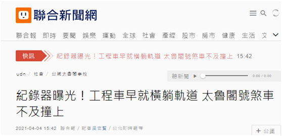 【环球网报道 记者 尹艳辉】台铁“太鲁阁号”408次列车出轨事故造成重大伤亡,据台湾《联合报》4月4日消息,该辆列车行车记录仪画面已经初步解读完毕,台湾“运输安全调查委员会”主委杨宏智4日表示,根据现有画面判断,肇事工程车早就横在轨道上,“太鲁阁号”刹车来不及才撞上,现在最重要的是调查工程车是怎么滑下去、以及究竟有无刹车。