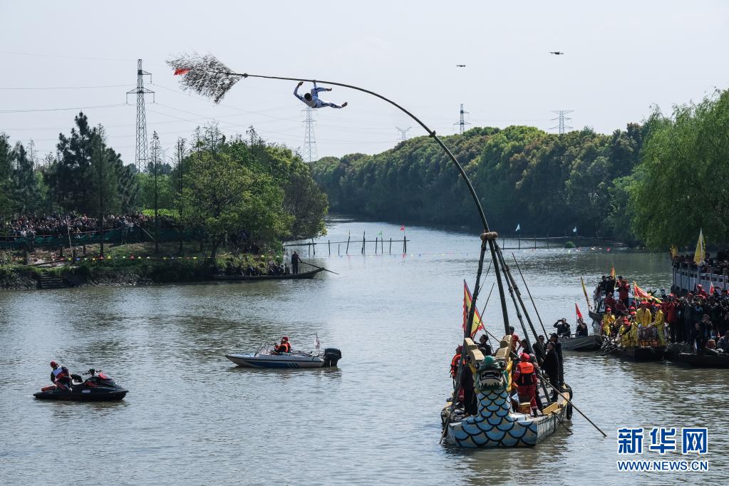 4月4日在“蚕花水会”现场拍摄的水上高杆船技展演,人在杆上翻、杆在船上立、船在河中行是高杆绝技的特色。