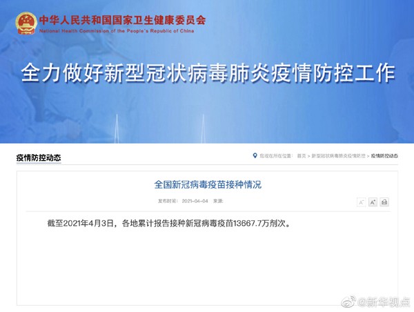 最大规模集中疫苗接种来了!国家卫健委4日发布,截至2021年4月3日,各地累计报告接种新冠病毒疫苗13667.7万剂次。