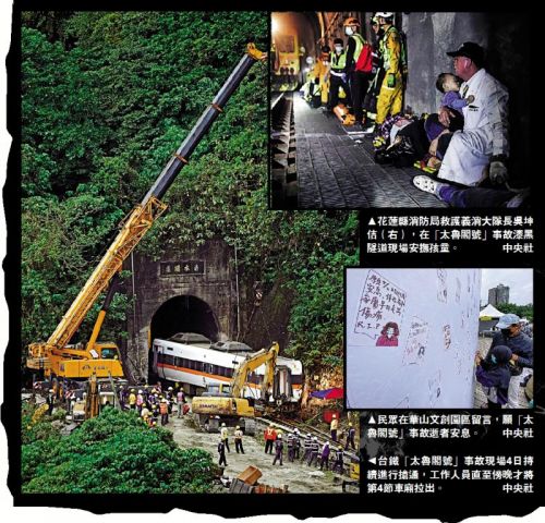 星岛环球网消息:据香港《大公报》报道,台铁“太鲁阁号”408次列车2日出轨事故造成重大伤亡,花莲地检署4日下午最终确定死亡人数为50人,其中48人已确定身份,另有2具遗体无身份姓名,待指认。对於工程车滑坡跌入路轨肇祸,台铁4日称,涉肇事工程车驾驶李义祥担任工地主任违规,台铁花莲工务段、监造及专案管理单位都有疏失。台建筑业界披露,全台工地约有80%皆无专任工地主任入驻现场,以致施工现场管理鬆散,各界批蔡政府难辞其咎。岛内运输安全调查委员会取得事故前列车黑盒影像,列车驾驶看到轨道上的工程车时只有约250公尺距离,仅得6.9秒时间反应,将列车煞停。