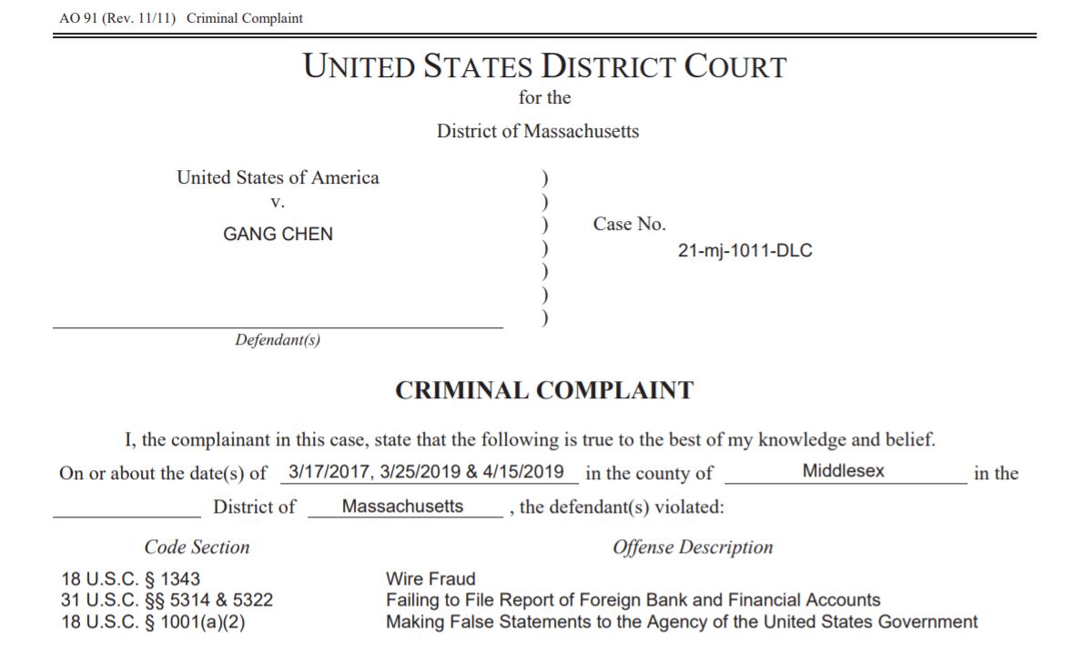 陈刚于今年1月被捕后,经历6个小时讯问后获准保释。被捕后的第五天即1月19日正式公布的起诉书里,陈刚被指控的具体罪名与检察官最初在电视上宣称的相距甚远,包括“接受2900万美元资助”“故意骗取美国经费”“向中国推荐人才”“帮助中国科技发展”等指控都不见踪影。起诉书最终所控罪名主要集中在两项行为上:未在向美国能源部申请经费和提交年度进展报告时披露自己与中国的关系,包括在中国担任多个顾问和评审专家身份;在持有多个中国银行账户的情况下,未向美国国税局申报。