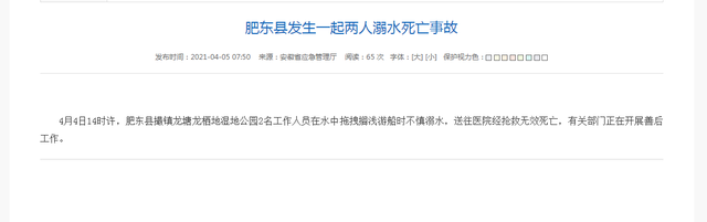 安徽省应急管理厅官网4月5日发布消息:4月4日14时许,肥东县撮镇龙塘龙栖地湿地公园2名工作人员在水中拖拽搁浅游船时不慎溺水,送往医院经抢救无效死亡,有关部门正在开展善后工作。