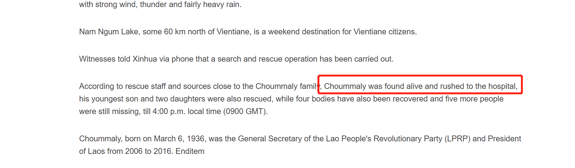 老挝首都万象附近的南俄湖旅游区4日发生游艇倾覆事故,造成8人死亡。新华社英文版4日下午援引一名目击者消息称,这起事故的伤亡人员中可能包括老挝前国家主席朱马利·赛雅贡。不过在当天稍晚些的报道中,新华社英文版又援引搜救人员以及与朱马利·赛雅贡家人关系密切的消息人士的话称,赛雅贡被发现还活着,并被紧急送往医院,他的小儿子和两个女儿也已获救。