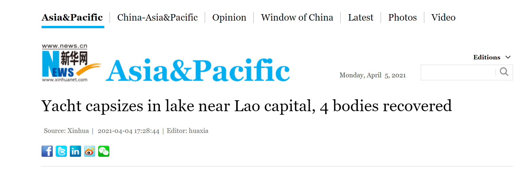老挝国家通讯社援引旅游区所在的万象省省长坎潘的话说,事故发生后,有关部门立即展开搜救行动。事发游艇上载有39人,事故造成8人死亡,其余31人已找到并被送往医院。目前,中国驻老挝大使馆没有收到有中国公民在这次事故中伤亡的报告。