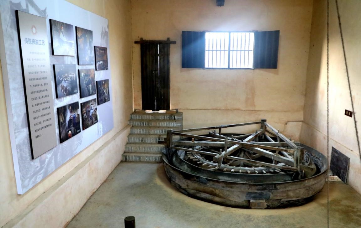 △贺页朵的孙子贺佐武、孙女贺常媛和重孙陈涛(从左往右)在榨油坊旧址参观榨油坊老照片以及一些革命照片