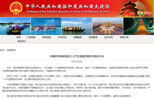 星岛环球网消息:海外网4月5日电 据中国驻印度大使馆网站消息,近日,某印度媒体刊登涉台错误社论,公然违背一个中国原则和印政府一贯立场,挑衅一个中国原则底线。中国驻印度使馆发言人就此发表严正声明,对该媒体错误言论表示强烈不满和坚决反对,并阐明中方原则立场。