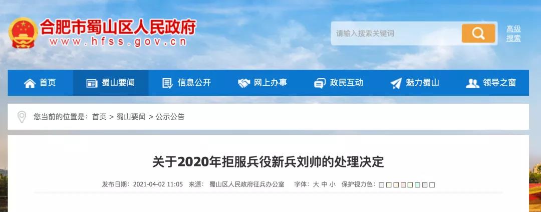 241053142021-04-06 07:41:58:656大学生拒服兵役,处罚公布!蜀山区,安徽,刘帅,年内,服兵役318234国内新闻国内新闻
