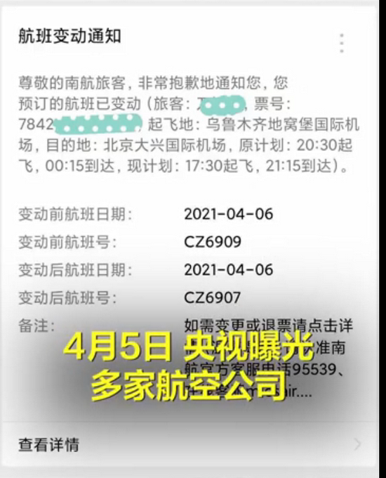 4月5日,央视曝光多家航空公司“随心飞”套餐问题,网友刀女士表示也遇到了一些类似的麻烦,此前买了南航“快乐飞2.0”,目前已遇到14次航变,多次对她行程造成影响,曾有一次航班变动三次的情况。4月1日,她从乌鲁木齐返京的航班取消,今日再被通知取消。