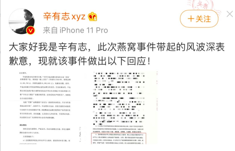 11月20日,辛巴方面也开始改口,称经检测这款“茗挚”燕窝在直播间推广销售时确实存在夸大宣传,燕窝成分不足每碗2克。11月27日晚,辛巴在其微博上承认在直播间推广销售的“茗挚”燕窝实为一款燕窝风味饮品,并对“燕窝事件”带起的风波深表歉意。对售出的燕窝将全部召回、承担退一赔三责任。