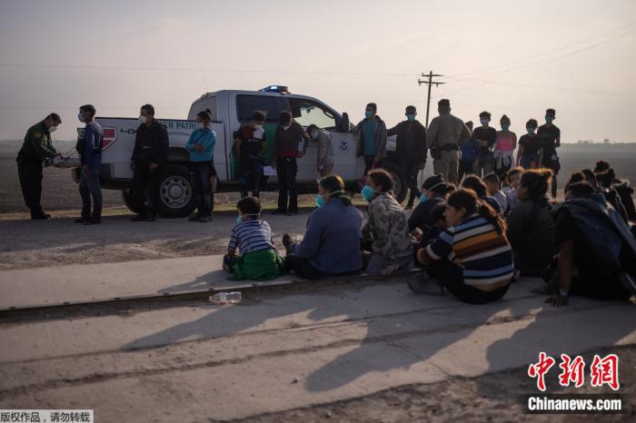 资料图:当地时间3月17日,美国得克萨斯州,边境执法人员与前来寻求庇护的非法移民家庭。