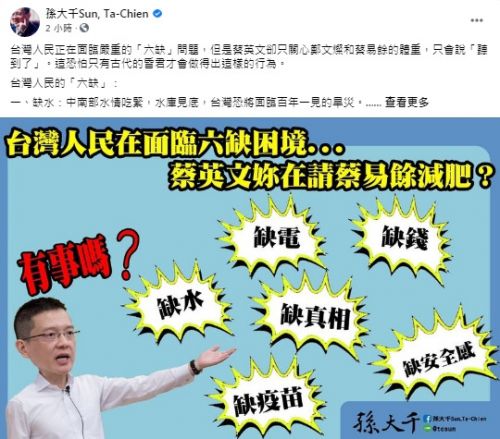 孙大千指出,无视台湾人民的“六缺”,蔡政府一人得道,鸡犬升天,吃香喝辣,唯一的一缺就是“缺德”。(孙大千脸书)