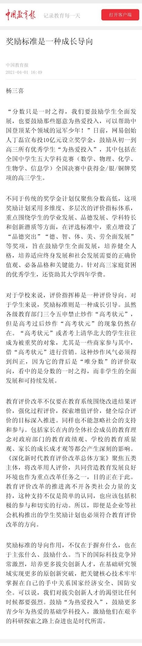 4月1日,由国家教育部主管、中国教育报刊社主办的《中国教育报》发表评论,指出扭转“唯分数”的评价取向,教育评价标准改革和奖励标准的转变将起到导向作用。除教育系统围绕改进结果评价,强化过程评价,探索增值评价,健全综合评价的目标深入推进改革外,企业等社会机构推出的学生奖励计划也必须符合教育评价改革的方向。文章对有道精品课“冠军计划”奖励标准给予了肯定,鼓励“为热爱投入”,鼓励学生全面发展,培养健全人格,与教育部倡导相一致,是通过奖励标准引导对学生评价标准转变的积极尝试。