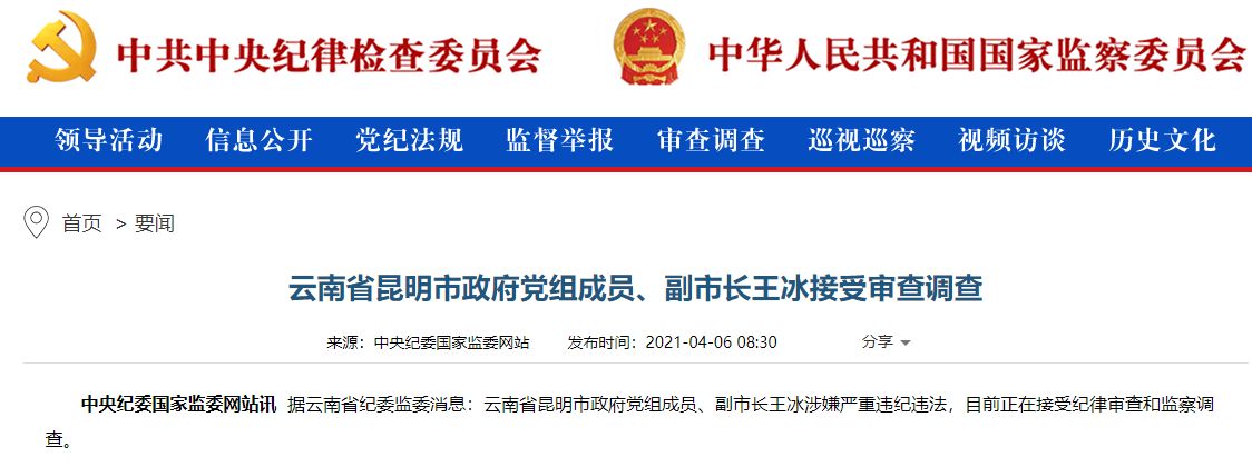 中央纪委国家监委网站4月6日通报,据云南省纪委监委消息:云南省昆明市政府党组成员、副市长王冰涉嫌严重违纪违法,目前正在接受纪律审查和监察调查。