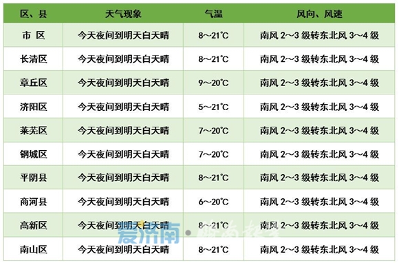 预计,今天夜间到明天白天,济南天气持续晴朗,南风2~3级转东北风3~4级,明晨最低气温5~8℃,明天最高气温21℃左右。