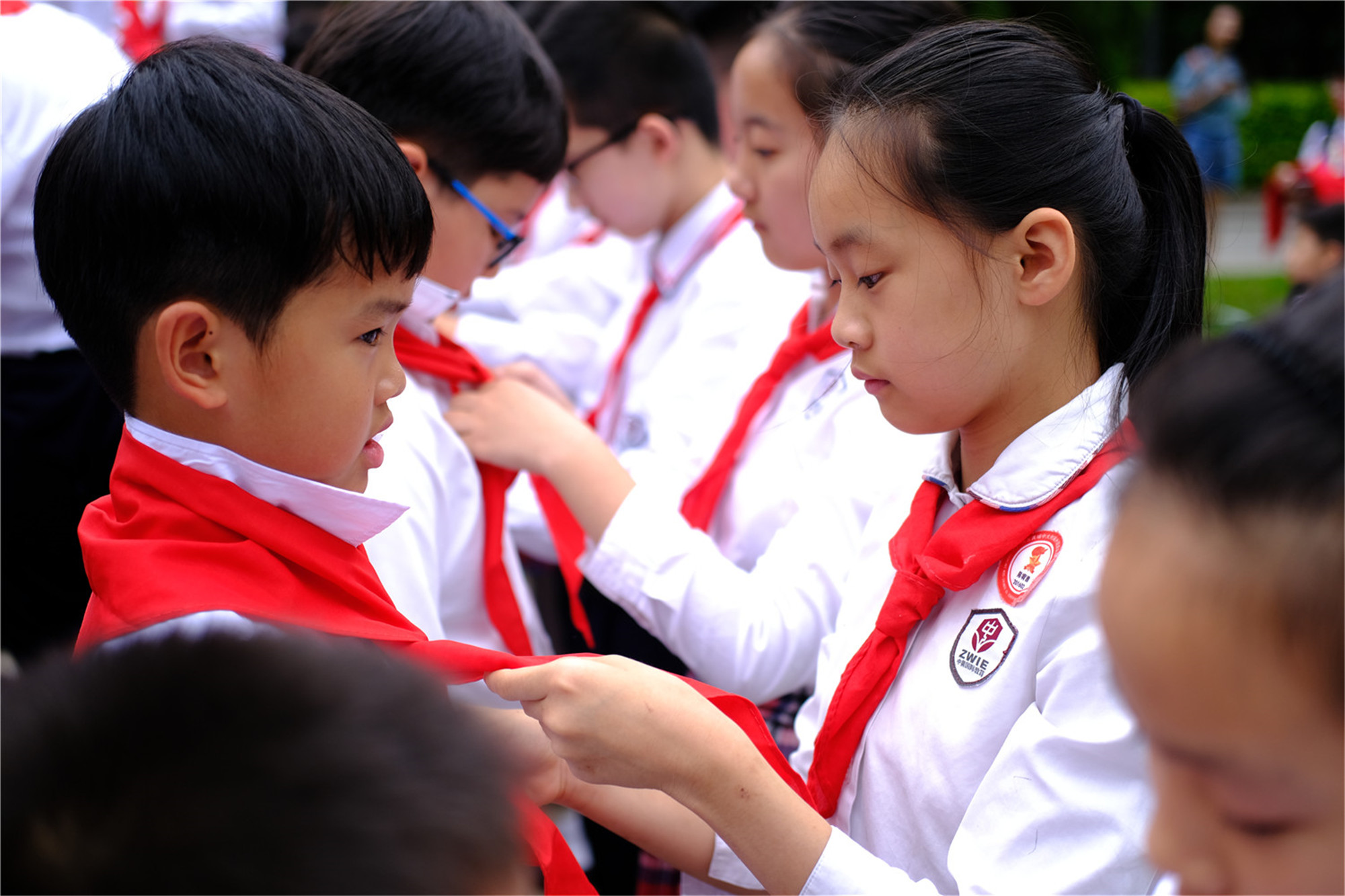 五六年级的哥哥姐姐正在为新加入少先队的弟弟妹妹们佩戴红领巾
